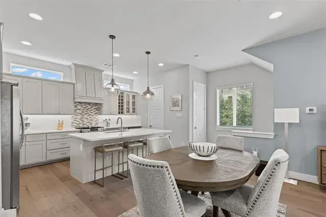 The first level welcomes you with a private guest suite and convenient access to the attached two-car garage. Upstairs, the main living level was designed for gathering and everyday comfort. The open-concept kitchen features quartz countertops, a gas range, custom cabinetry, a generous island, and a walk-in pantry, flowing easily into the dining and living areas. A covered balcony and expanded powder bath add both function and character to the space. The top floor is anchored by a spacious primary retreat with a spa-inspired bath and large walk-in closet. Also on this level is a third en-suite bedroom that also makes a great office, along with a wet bar and laundry area that add convenience to daily living.
