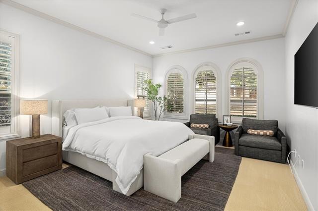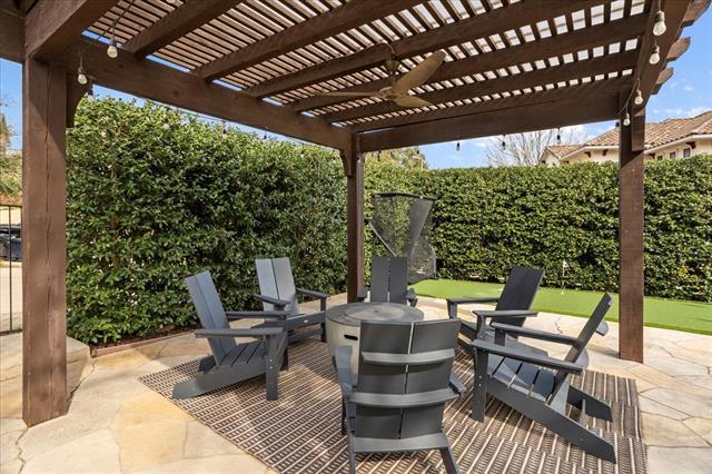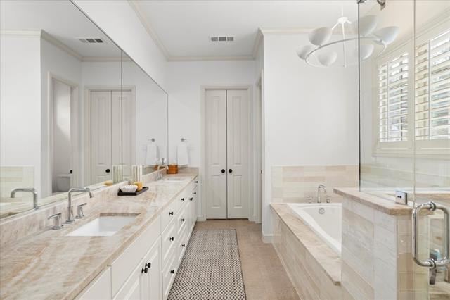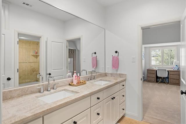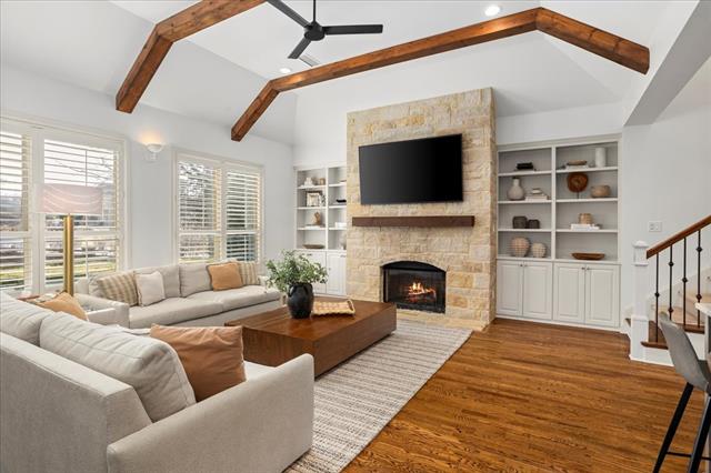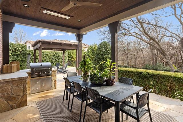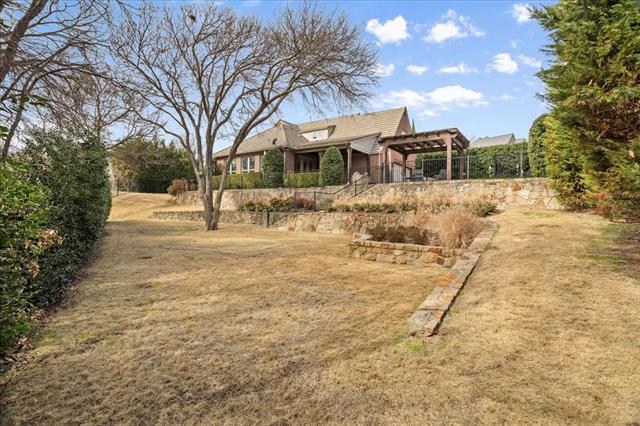 This stunning Tudor style home is located on a prime corner lot in the guarded, gated community of Mira Vista. Beautifully remodeled in 2023, this home blends timeless charm with modern updates. The magnificent living room features gorgeous cathedral ceilings with wood beams and a dramatic stone fireplace, opening to an inviting floor plan ideal for entertaining. The updated kitchen offers quartz countertops, gas cooktop, and abundant storage. The primary suite includes double vanities, a large relaxing garden tub and walk-in closet. A private guest suite with en-suite bath is also located downstairs, along with a laundry room and half bath for guests. Upstairs features two generous bedrooms with Jack and-Jill bath, a private home office, a large game room, and walk-in storage space. The backyard is an entertainers dream with a covered patio, outdoor kitchen, stone decking, pergola, multiple seating areas and a putting green. The beautifully landscaped yard offers a spacious amount of green space and backs up to a peaceful resident nature trail offering scenic surroundings.