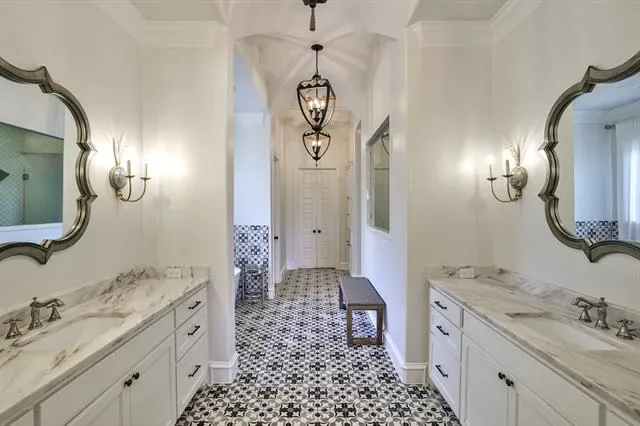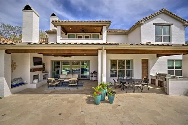 This custom Mediterranean Estate built by Glendarroch Homes in 2017, is located within the exclusive gated and guarded golf course community of Mira Vista and is perfectly positioned along the 17th fairway, offering breathtaking views from nearly every room. Expansive windows fill the home with natural light while showcasing the resort-style pool and outdoor living spaces, creating an ideal setting for relaxation and entertaining. The gourmet kitchen is a chef’s dream, featuring quartz countertops, professional-grade appliances, a large island, and an oversized pantry. The butlers pantry and wine room are an entertainers dream! The primary suite serves as a private retreat with a spa-inspired ensuite, complete with a freestanding soaking tub, separate shower, dual vanities, and a custom walk-in closet, while a guest bedroom with its own ensuite is also conveniently located on the main level. Upstairs, you’ll find three additional guest bedrooms, two full baths, a media room, exercise room, and a game room with a full wet bar. Large sliding glass doors seamlessly connect indoor and outdoor spaces, enhancing the home’s entertaining appeal. The oversized three-car garage features epoxy flooring, and the backyard offers a spacious pool and spa with multiple water features, a grilling area, wood-burning fireplace, and multiple balconies and porches-all designed to capture stunning golf course views from every angle of the property.