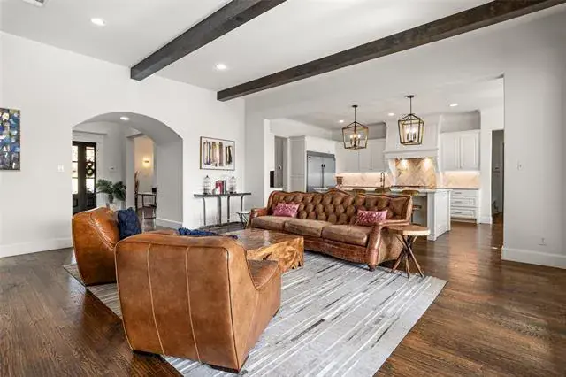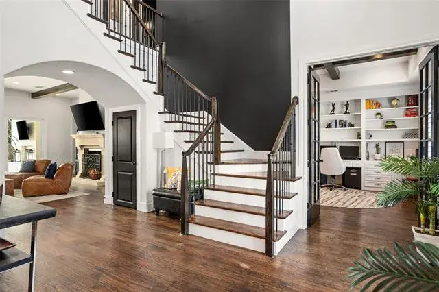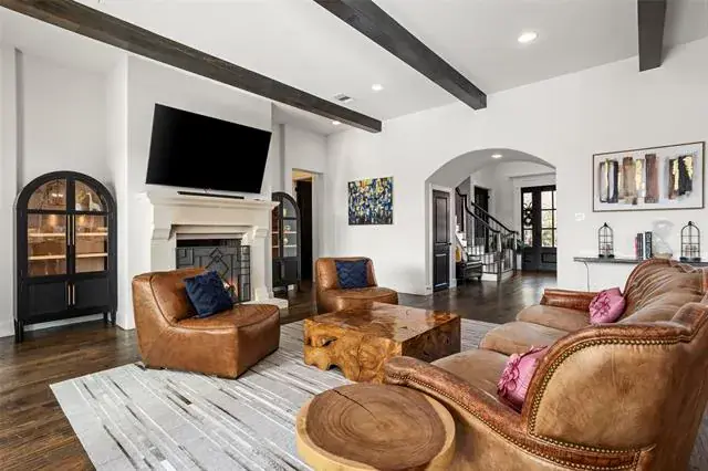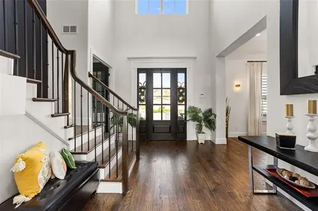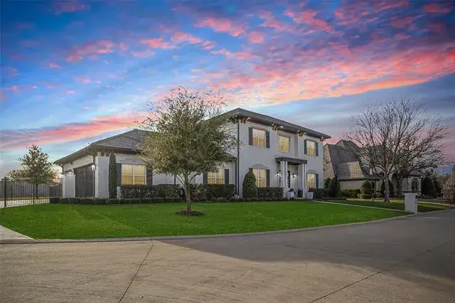 Resort style living in beautiful, guarded Mira Vista. Built by Glendarroch Homes in 2018, this home has everything! A grand foyer welcomes you inside with gorgeous hardwood floors and a stately staircase, flanked by a study with glass French doors and a large formal dining room. The spacious family room is open to the luxury kitchen with high-end stainless-steel appliances, exquisite quartz countertops, and a large butler pantry with built-in full size wine fridge. First floor primary suite with spa-like bathroom, double vanities, make-up counter, and 2 large walk-in closets. A secondary guest suite is also located on the first floor, with a large en-suite bathroom. Upstairs boasts a giant flex room with built-in sink, mini-fridge, and a second powder bath. Off the flex room is a large media room, perfect for watching movies and games! There are 2 large bedrooms on the second floor, both with their own en-suites and large walk-in closets. The backyard is its own oasis! A covered patio with retractable shades, a cozy, gas fireplace, large glass sliding doors, and a built-in grill. The sparkling pool and spa were built in 2021, with waterfall features and a fire pit! The driveway is gated, with extra space for the basketball goal or riding bikes, all on quiet cul-de-sac, backing up to the Mira Vista nature trail.