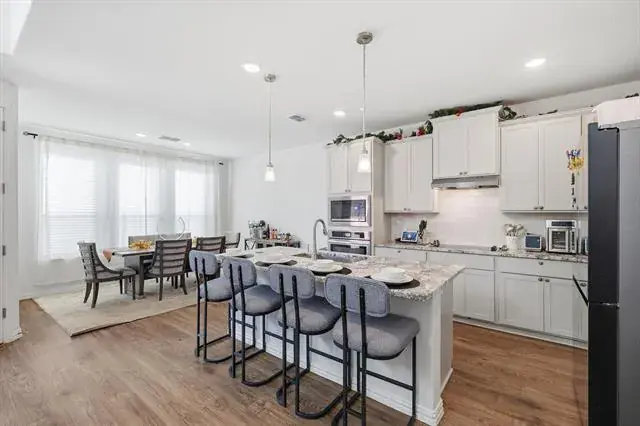 Outside, the covered patio looks out over an open, grassy backyard that feels ready for weekend barbecues, playtime, or simply enjoying the quiet of a Texas Sky. This is a home designed to grow with you, offering comfort, light, and flexibility in all the right places. Come see how easily life fits here.