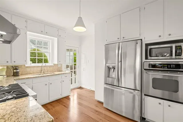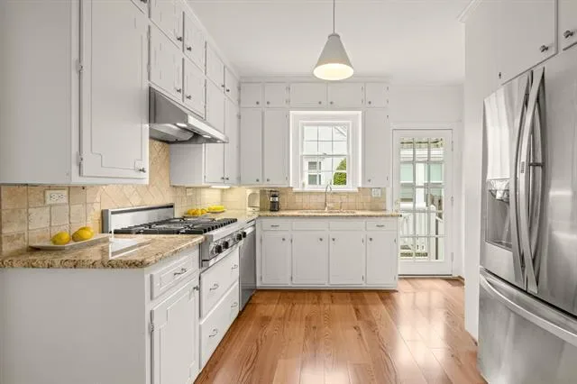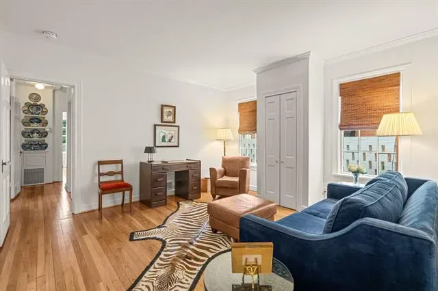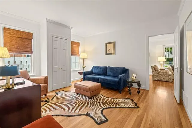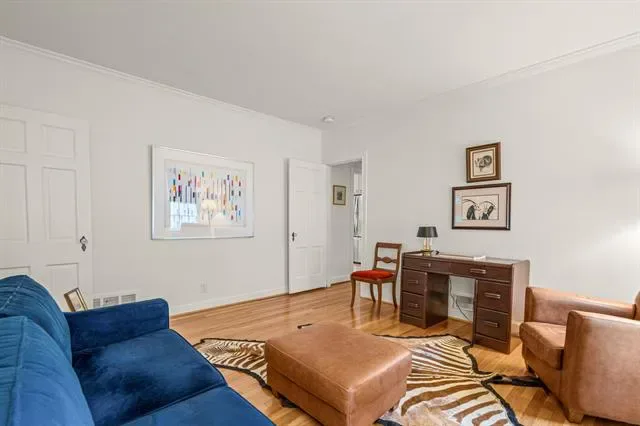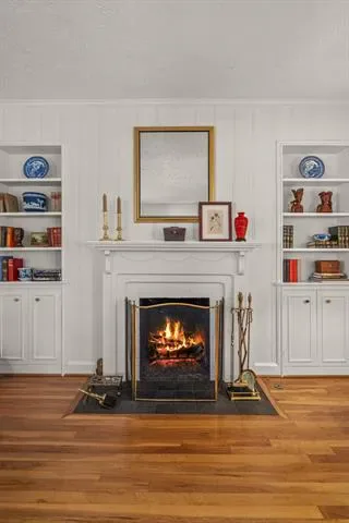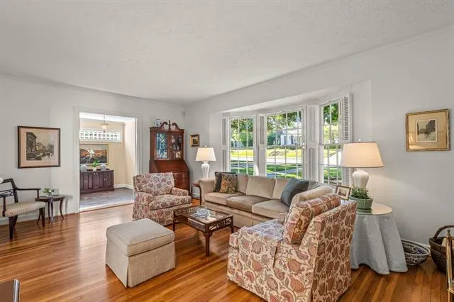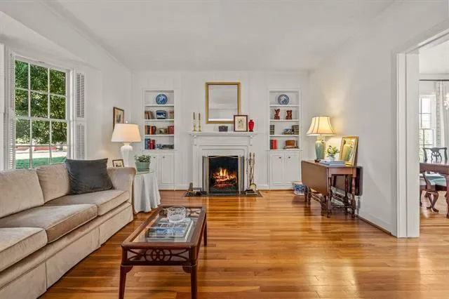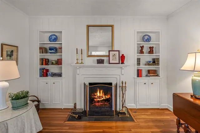 The living room is a true showcase of style with its stunning bay window and cozy fireplace that adds a touch of elegance. The decorative moldings and built-ins throughout provide both character and functionality.