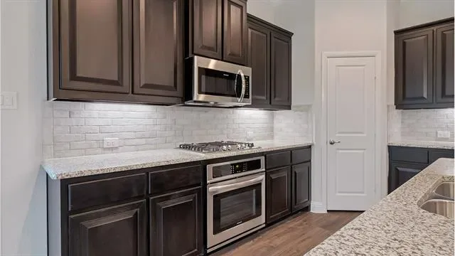 Beautiful new D.R. Horton home in the Morningstar community located in highly sought-after Aledo ISD! The Willow floorplan, Elevation A, with an estimated Summer completion, offers a spacious two-story layout with 4 bedrooms, 3.5 bathrooms, a game room, and a 2-car garage, designed for comfortable living and entertaining. The open-concept design features a generous family room that flows into the dining area and modern kitchen, creating an inviting space for everyday living. The kitchen includes 42” upper cabinets with crown molding, cabinet hardware, soft-close drawers and cabinets, quartz countertops, a ceramic tile backsplash, stainless steel appliances, a gas range, and a pantry for added storage. RevWood flooring extends throughout the main living areas for durability and style, and a convenient mud room adds everyday functionality. The private primary suite is located on the first floor and features an en-suite bath with dual sinks, a separate soaking tub and walk-in shower, and a spacious walk-in closet. A study is also located on the first floor, offering flexible space for a home office or formal dining area. The second level includes three additional bedrooms and a large game room, providing plenty of room for family, guests, or entertainment. A covered patio enhances outdoor living, while modern finishes, energy-efficient construction, and America’s Smart Home Technology package add everyday convenience. Exterior features include a landscaping package with a full sprinkler system and a fully fenced backyard. Morningstar residents enjoy resort-style pools, playgrounds, parks, a dog park, and scenic walking trails.