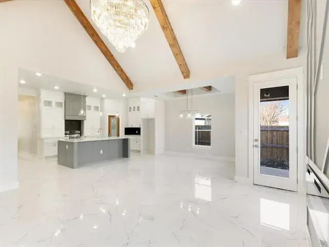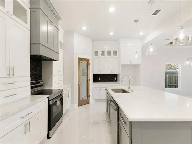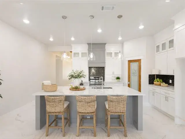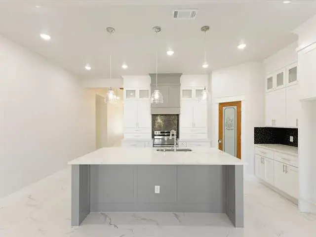 Large ceramic tile flooring flows seamlessly across the home, creating a clean and sophisticated foundation for everyday living. The heart of the home is the stunning open-concept kitchen, dining, and living area — ideal for entertaining or enjoying time with family. A spacious center island anchors the kitchen, complemented by marble countertops, a generous corner pantry, and sleek, modern finishes that blend beauty with functionality.