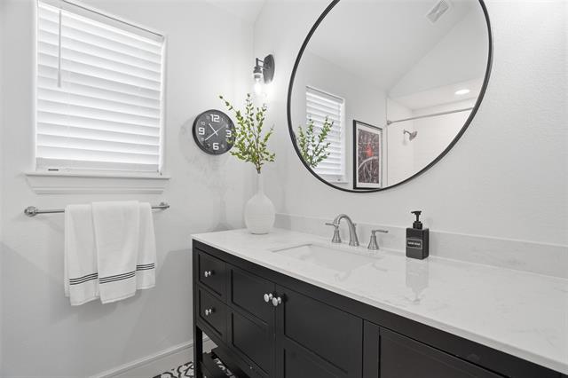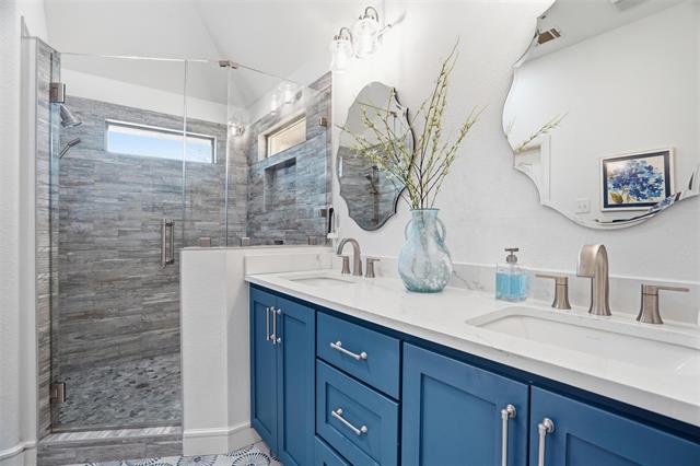 The primary suite offers a peaceful retreat with a beautifully updated ensuite bath featuring decorative tile flooring, a walk-in shower, dual sinks, and a walk-in closet with built-in storage. The secondary bedrooms are equally charming and share a hall bath with dual sinks and stylish tile flooring.