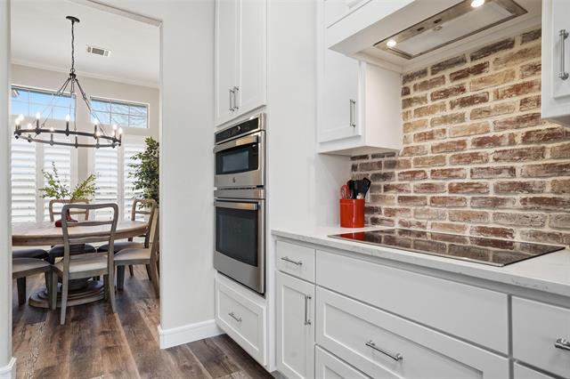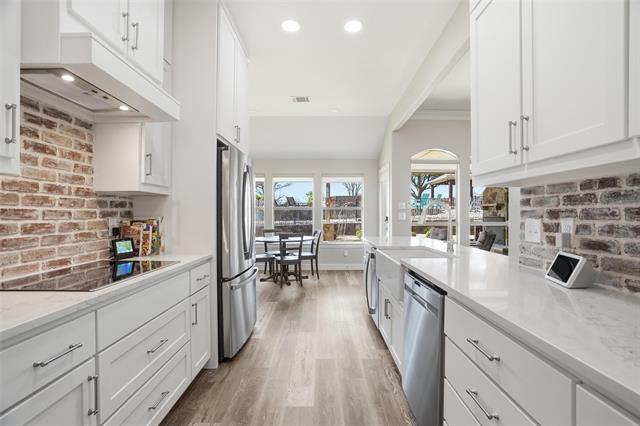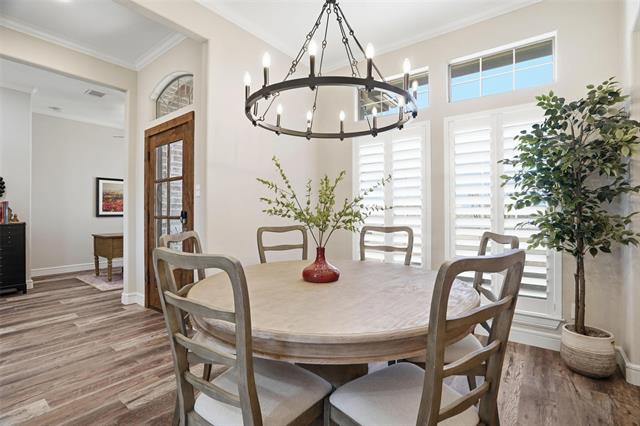 Step inside to an abundance of natural light and an inviting formal dining area just off the entry. Luxury vinyl wood flooring flows throughout the home, offering both style and easy maintenance. The spacious living room features a cozy gas fireplace, expansive windows overlooking the backyard, and remote-controlled window coverings, all seamlessly opening to the stunning kitchen. The kitchen is a true chef’s delight, showcasing quartz countertops, a charming brick backsplash full of character, farmhouse sink, abundant cabinetry, and a large pantry for exceptional storage.