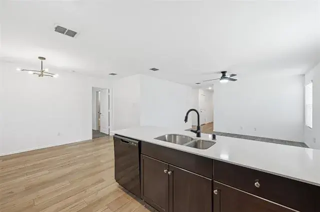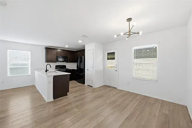 Step inside and you’re immediately greeted by abundant natural light that fills the home, highlighting the clean lines and contemporary finishes throughout. The main living areas feature stylish vinyl flooring, providing both durability and a polished aesthetic ideal for everyday living and entertaining. The kitchen is well-appointed with sleek black appliances, including a refrigerator, offering a cohesive and modern look while remaining practical and easy to maintain.