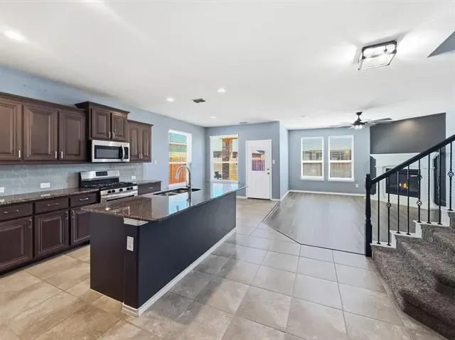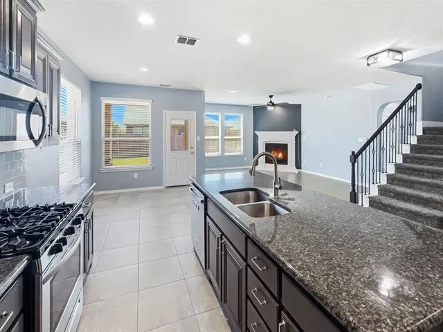 The open-concept living area flows into the casual dining space and kitchen, which features granite countertops, a large island with breakfast bar, recessed lighting, and a walk-in pantry.