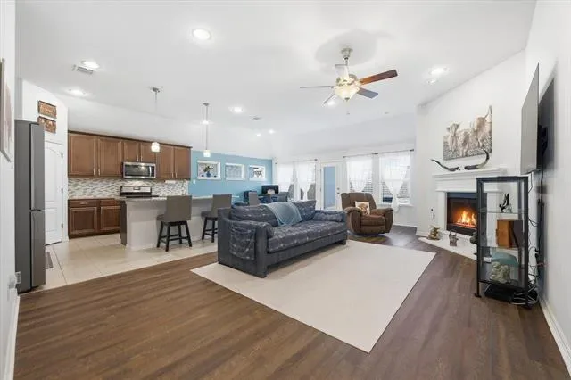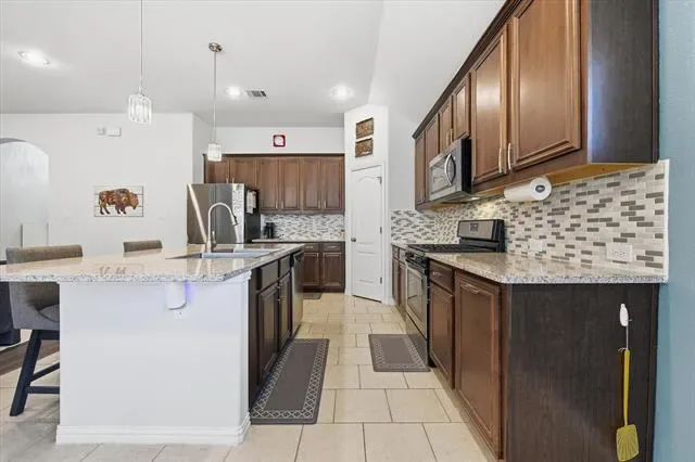 Step inside to an inviting open-concept layout where the gourmet kitchen flows effortlessly into the living and dining areas—ideal for entertaining or relaxed daily living. The kitchen is thoughtfully appointed with stainless steel appliances, granite countertops, elegant pendant lighting, and a convenient pull-out trash receptacle.