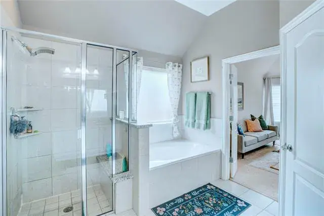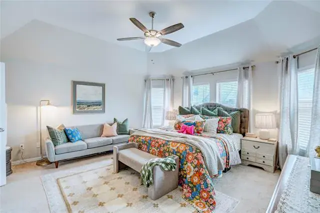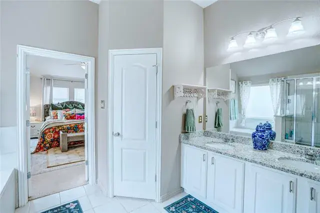 The private primary suite delivers a peaceful escape with a spa-inspired bath, dual vanities, soaking tub, walk-in shower, and an oversized walk-in closet designed to keep everything beautifully organized.