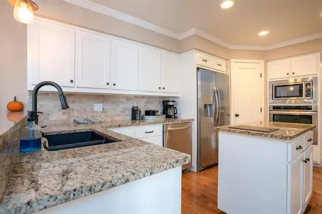 or office. The gourmet kitchen serves as the heart of the home, featuring rich granite countertops, a