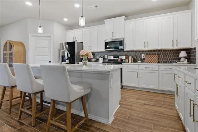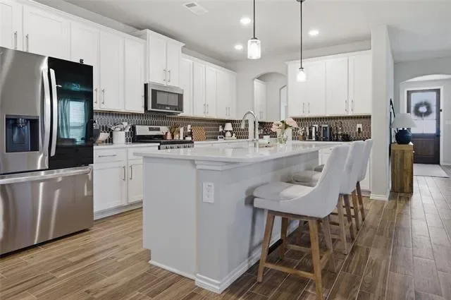 The first floor features stunning beveled glass front door, wood-look ceramic tile flooring throughout, creating a cohesive and elegant living space. Designed for both comfort and functionality, the layout includes a private office with glass doors, a formal dining room, a butler’s pantry, a powder bath, a spacious living area, and an oversized walk-in pantry. The beautifully appointed kitchen showcases upgraded quartz countertops, an enhanced backsplash and sink, upgraded lighting, and a premium gas range with microwave. A bright dining nook completes the heart of the home.