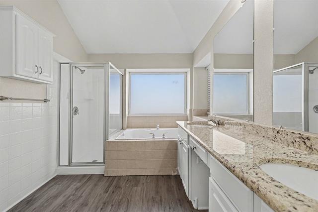 The primary suite offers the en-suite bath featuring a dual-sink white vanity with granite countertops, a separate shower, and a soaking tub. The hallway bath offers dual access for the remaining three bedrooms, complete with granite countertops and a double-sink vanity.