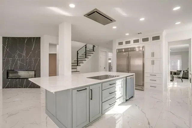 YOU WILL BE IMPRESSED FRONT DECORATIVE TALL METAL DOUBLE DOOR ENTRANCE 7X41 LIVING ROOM OPEN AREA TO DINNING AREA SERVING AREA WITH A WALK IN PANTRY, BUILT IN SHELVES AND DRAWERS KITCHEN: 2 BUILT IN STOVES ONE GAS WITH GLASS VENTHOOD BUILT IN MICROWAVE AND CONVENTIONAL OVEN ISLAND WITH BUILT IN ELECTRIC STOVE WITH VENTHOOD ,VERY STRONG EXTRACTOR, GRANITE TOP AND SEATS ABOUT 6 PEOPLE BREAKFAST AREA OPEN TO FAMILY ROOM TV SCREEN FOR SURVELLIANCE CAMERAS. ELECTRIC FIREPLACE BEDRROOM WITH BUILT IN DRAWERS BACK PORCH18X14, ROOM FOR OFFICE OR GYM WITH GLASS FRENCH DOORSUTILITY ROOM WHASER AND DRYER ROOM, BUILT IN CABINETS GARAGE JUST RENOVATED FLOOR WITH PARTIAL SEE TROUGH DOOR WITH CONTROLSTAIRS WITH GLASS SIDE PROTECTIVE LIVING ROOM MASTER BDR WITH FIRE PLACE MASTER BATH LARGE MIRRORS BUILT IN VANITIES A ROUND 5′ TUB AND A SHOWER WITH GLASS DOOR’ WALK IN CLOSSET 6X14 BUILT IN DRAWERS, ENCLOSED TOILET MEDIA ROOM 3 BEDRROMS WITH BUILT IN DRAWERS CEILING FANS WITH CONTROL, 2 FULL BATHROOMS WITH GLASS DOOR SHOWERS, HALLWAY LINENS CLOSET AND A DROP IN DIRTY CLOTHES SHOOT TO THE LAUNDRYROOM, HARWOOD FLOORS IN SECOND FLOOR DECORATIVE LIGTHS INSIDE AND OUTSIDE ENEERGY SAVER THERMOSTAT AND MUCH MORE A MUST SEE