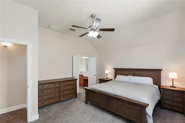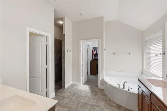 The luxurious primary suite includes an ensuite with a garden tub, oversized walk-in shower with dual showerheads, dual vanities, and a large walk-in closet. The primary walk-in closet flows into the laundry room. The two additional bedrooms also feature walk-in closets, offering ample storage for the whole family.