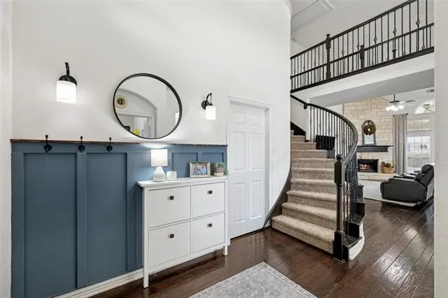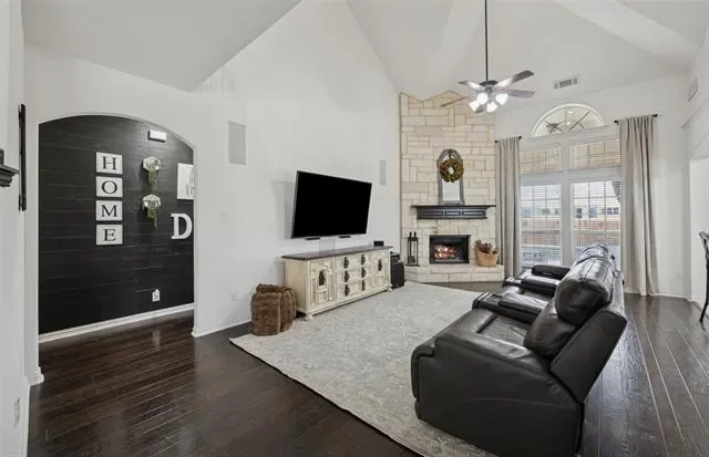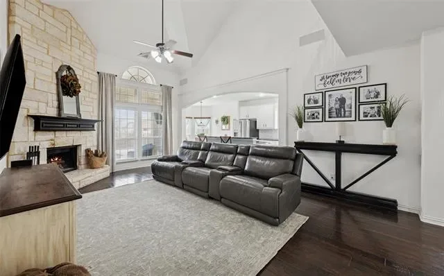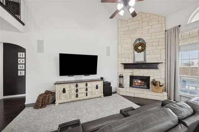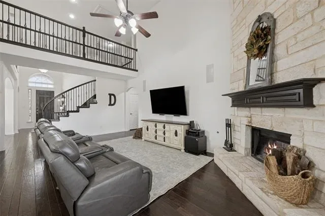 Welcome to 9304 Tunilla Court — thoughtfully designed for both everyday living and effortless entertaining. Rich wood flooring runs throughout the main living areas, adding warmth and continuity across the first floor. The expansive living room features soaring ceilings, abundant natural light, and a striking stone fireplace, seamlessly connecting to the kitchen and dining areas.