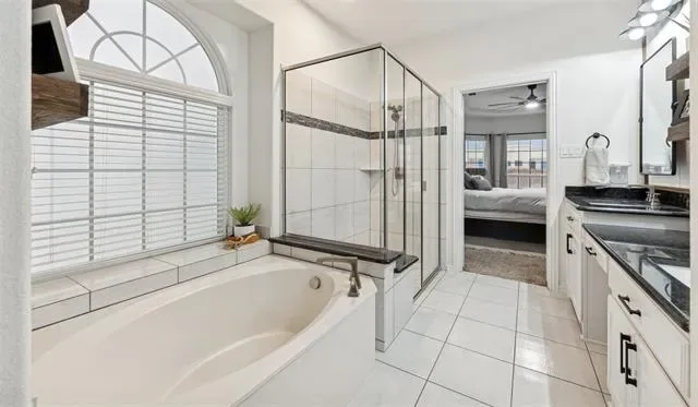 The primary suite is privately located downstairs and serves as a relaxing retreat with a spacious bedroom and ensuite bath featuring dual vanities, soaking tub, and separate shower.