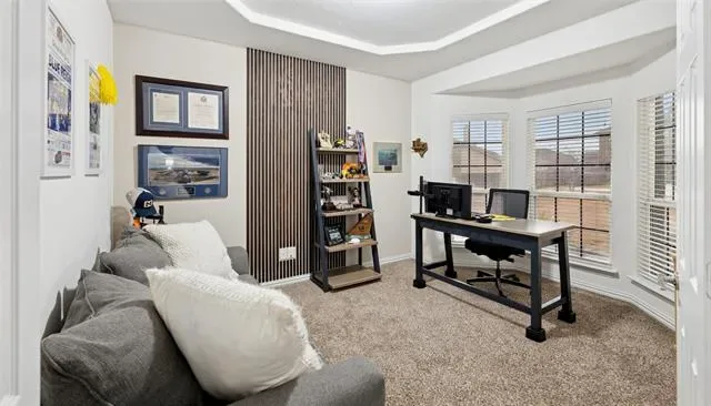 The kitchen offers generous counter space, ample cabinetry, stainless steel appliances, and a breakfast bar overlooking the living room — ideal for gathering and daily functionality. A dedicated home office at the front of the home provides a quiet work-from-home setup or study space. A half bath and laundry room complete the main level.