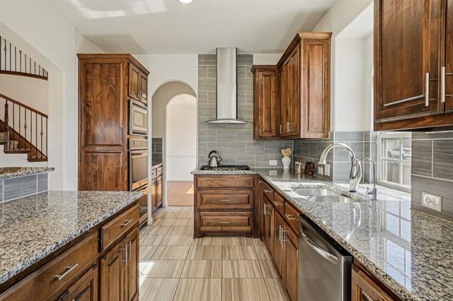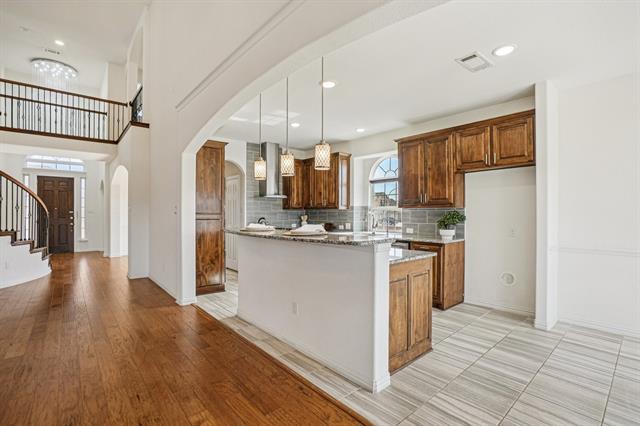 The spacious living area is anchored by a striking upgraded stone fireplace, creating a warm and inviting focal point. The gourmet kitchen is a chef’s dream, featuring granite countertops, a 5-burner gas cooktop, butler’s pantry, and walk-in pantry, offering both beauty and functionality.