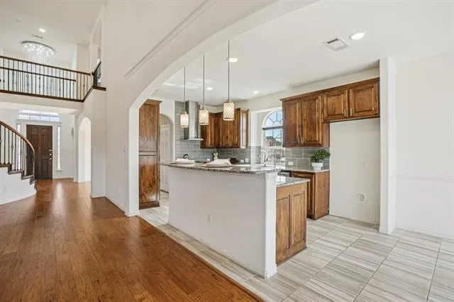 The spacious living area is anchored by a striking upgraded stone fireplace, creating a warm and inviting focal point. The gourmet kitchen is a chef’s dream, featuring granite countertops, a 5-burner gas cooktop, butler’s pantry, and walk-in pantry, offering both beauty and functionality.