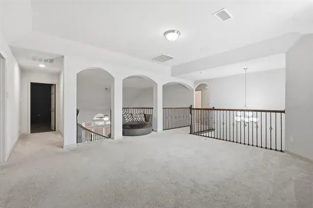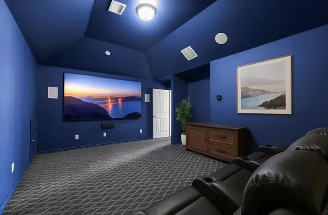 The primary suite is conveniently located downstairs and features built-in stereo speakers in the bathroom for a true retreat feel. The home’s audio experience expands with built-in speakers in the kitchen, living room, patio, loft, and media room, including 7.1 surround sound in the media room and 5.1 surround sound in the living room. The stereo tuners in both the living room and media room stay, and the projector and screen are included for movie-night perfection.