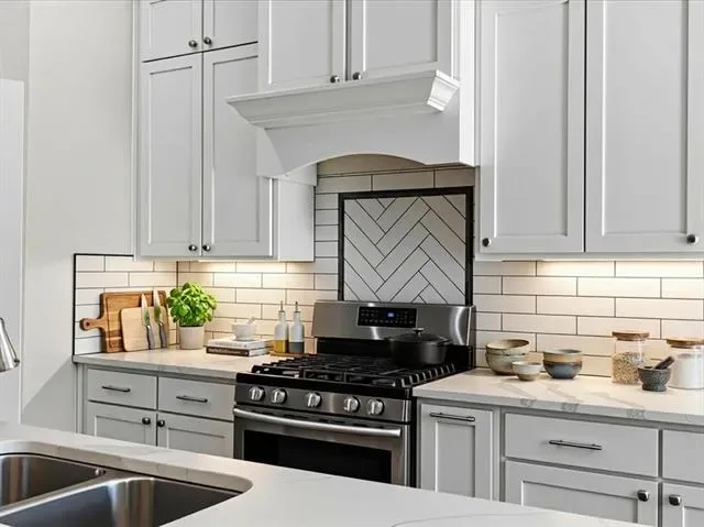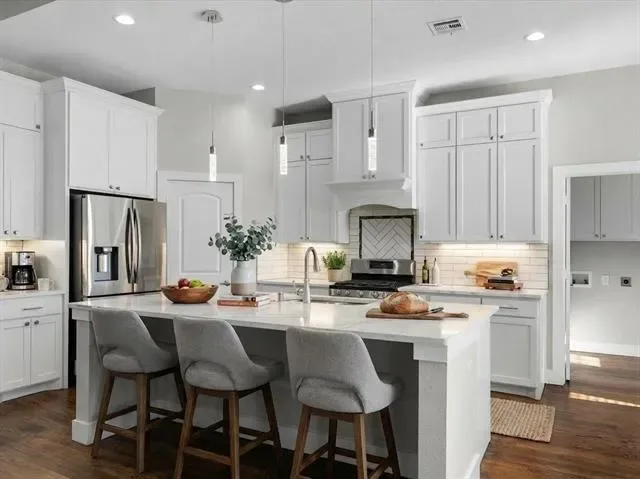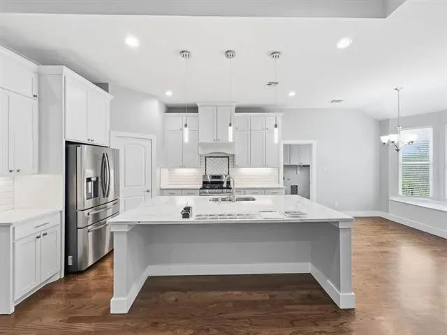 Interior highlights include hardwood flooring, custom cabinetry, quartz countertops, stainless steel appliances, and a gas range. The open layout creates a seamless flow between the kitchen, dining, and living areas, providing an inviting space for everyday living and entertaining.