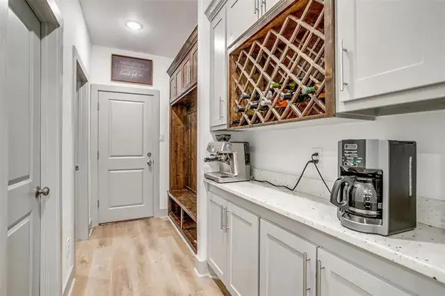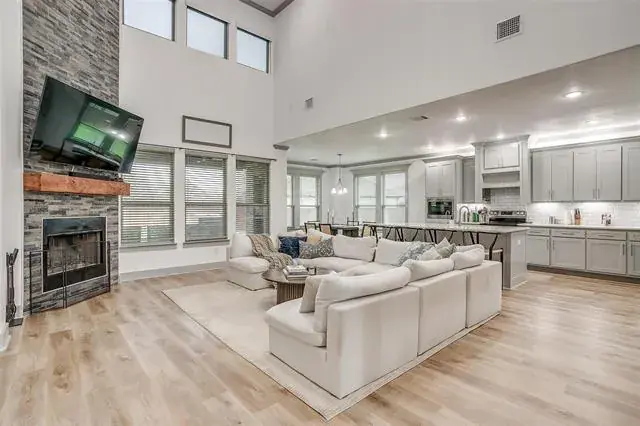 The thoughtfully designed layout includes a primary suite complete with a spa-like soaking tub and walk-in shower with a versatile study which can serve as a fourth bedroom on the main level, while a spacious loft, two additional bedrooms, and a full bath await upstairs. Luxury vinyl plan wood flooring flows throughout, complementing the chef’s kitchen, built-in coffee and wine bar, and charming mudroom nook off the garage. The striking fireplace with a newly updated mantle extends to the tall ceilings, creating a stunning focal point. Outside, the private backyard is an entertainer’s dream featuring an extended covered patio perfect for hosting gatherings featuring a built-in grill.