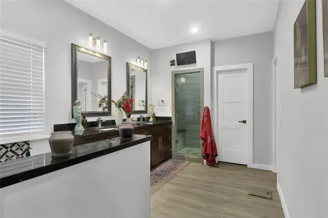 Custom family residence situated on an expansive lot featuring an open floor plan between the kitchen, living, and dining areas, providing an wonderful space for family gatherings and entertaining. The living room offers a view of the covered patio and backyard, complete with a cozy fireplace. The master suite is spacious and contemporary, equipped with a separate enclosed shower, dual vanities, and a large walk-in closet. There is a guest bedroom located on the ground floor that connects to a full bathroom, making it an ideal space for a mother-in-law suite. The upstairs also includes a junior master bedroom with an adjoining bathroom, along with another bedroom and bathroom, for 3 full bathrooms on the upper level and 1 full bathroom on the ground floor (4 full bathrooms in total). An additional living room on the upper level could serve as a home office or an extra bedroom. The property features a 3-car garage in addition to a 2-car garage-workshop with a mini kitchen and bathroom. There is no homeowners association!