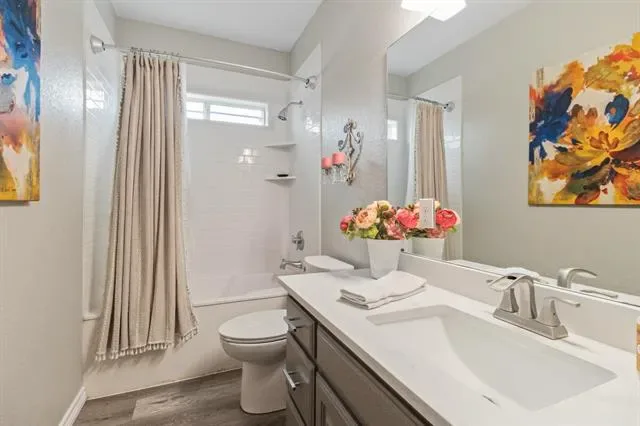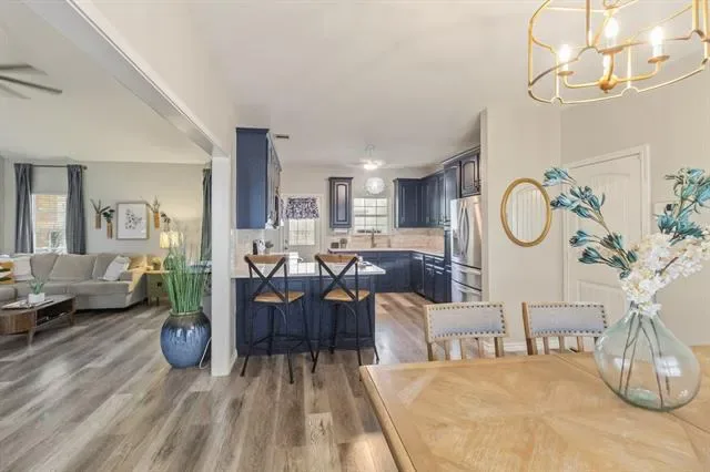 The kitchen features a breakfast bar, ample counter space, and a dedicated dining area, while the private primary suite includes dual sinks, a walk-in closet, and a spacious shower. Well-sized secondary bedrooms and a dedicated laundry room add even more function to a layout that feels both practical and inviting.