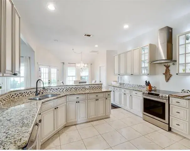 Stunning 4-bedroom home nestled on nearly half an acre, offering space, comfort, and privacy. Step inside to a bright, welcoming living area featuring soaring ceilings, rich bamboo flooring, and a striking stone fireplace that anchors the space. The chef-inspired kitchen is designed to impress with stainless steel cooktop and oven, granite countertops, an oversized breakfast bar, decorative lighting, a massive walk-in pantry, and abundant cabinetry for storage.