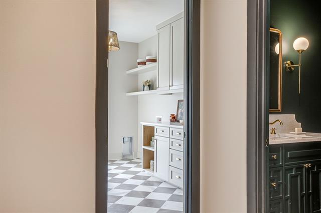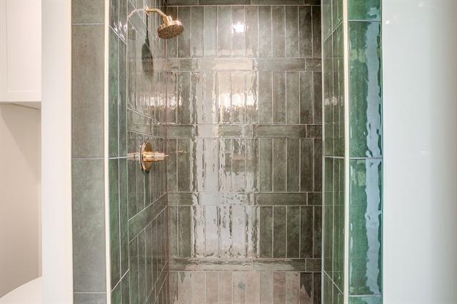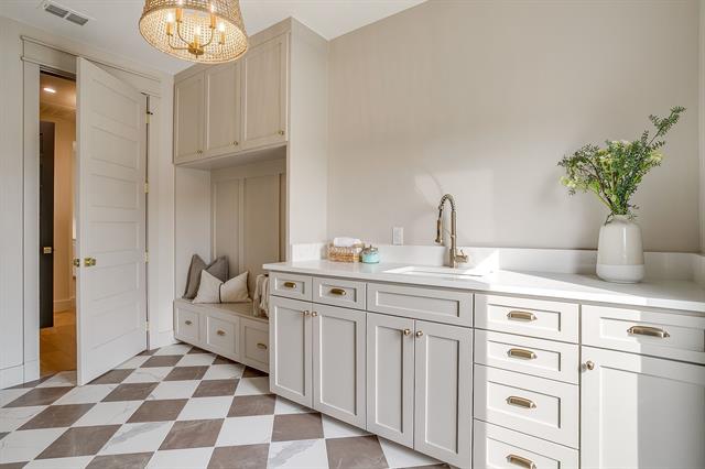 The powder bath makes a striking statement with Taj Mahal quartzite countertops and a custom-designed vanity, offering a sophisticated and memorable space for guests.All bathrooms are beautifully appointed with designer tile selections, including statement showers and elevated finishes that reflect exceptional craftsmanship.