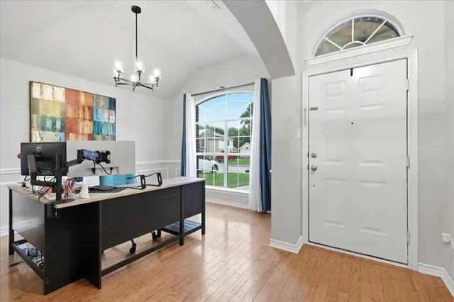 Upon entering, you are greeted by an office featuring large windows and abundant natural light. The kitchen is designed for both functionality and entertaining, offering ample cabinet and counter space, a corner walk-in pantry, and a seamless flow into the dining and living areas. The living room boasts of natural lighting, a sitting nook and lovely wood burning with gas fireplace.