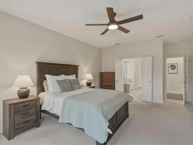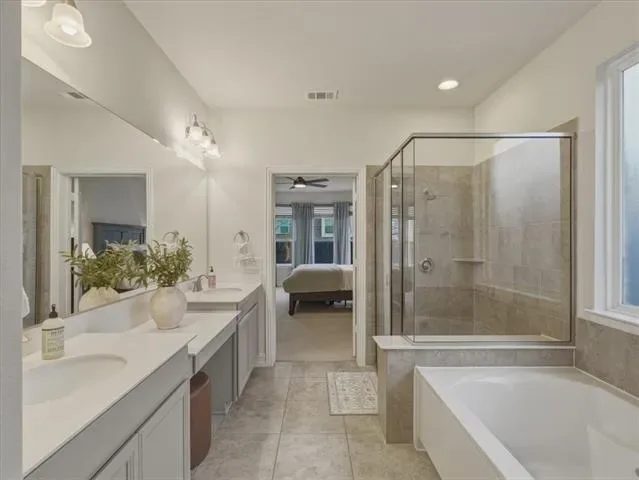 The primary suite is conveniently located on the first floor and includes a sitting area, dual vanities, separate tub and shower, and a spacious walk-in closet. Upstairs, secondary bedrooms are thoughtfully arranged, including one with a private ensuite bath.