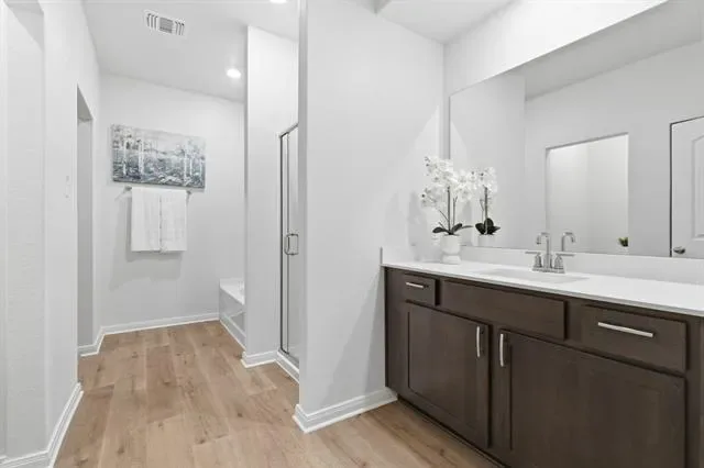 The private first-floor primary suite offers a relaxing retreat with a spacious walk-in closet, dual sinks, a garden tub, and a separate shower. Upstairs, you’ll find four generously sized bedrooms, all with walk-in closets, plus a large game room perfect for movie nights, a playroom, or a second living space.