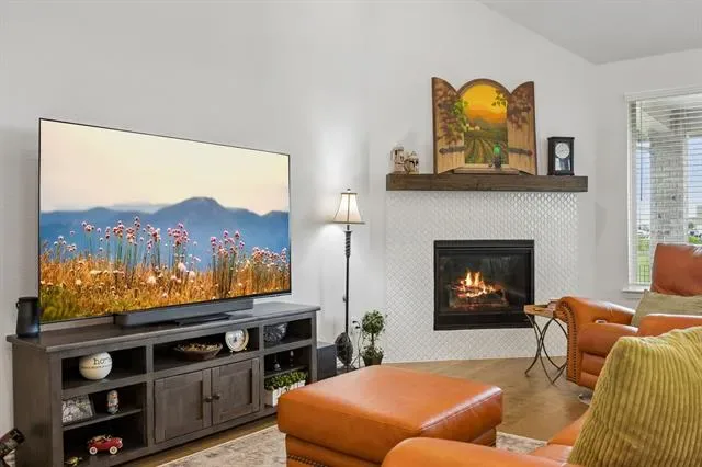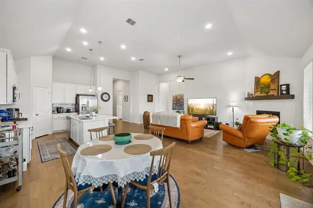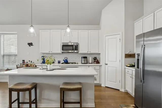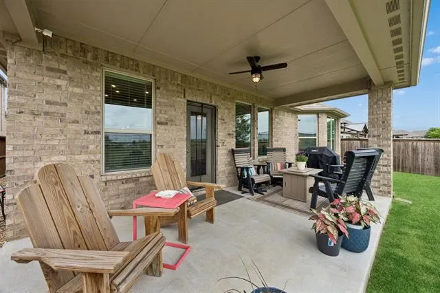 Welcome to 10324 Lakemont Dr, a well-appointed single-story home offering 3 bedrooms, 2 bathrooms, and approximately 1,998 square feet of thoughtfully designed living space built in 2021. This property stands out for its seamless blend of comfort, function, and location, appealing to buyers searching for a move-in ready home with modern upgrades and strong community amenities. A welcoming entry introduces a flexible front hallway with secondary bedrooms positioned for privacy, while the open-concept living, dining, and kitchen areas create a natural gathering space enhanced by elevated ceilings, abundant natural light, and a warm, inviting fireplace. The kitchen is designed for both everyday use and entertaining, featuring generous cabinetry, durable countertops, stainless steel appliances, and a large island that anchors the space and supports casual seating. Recent improvements elevate both style and efficiency, including a custom steel front door from Love That Door, a steel insulated garage door with beltdrive Bluetooth opener, overhead garage storage racking, and programmable Jellyfish eave lighting with thousands of color options for year-round accent or holiday display. Custom rock and flagstone pavers along the sides of the home add distinctive curb appeal and functional outdoor pathways. The backyard offers a unique advantage with no rear neighbors, backing to an expansive greenbelt that enhances privacy and open views. Outdoor features include a gas fire pit and a patio plumbed for a grill connection, ideal for entertaining or relaxing. Residents benefit from convenient access routes with no rail crossings, proximity to grocery stores, stocked ponds, and miles of walking paths throughout the community. A nearby community center with a swimming pool further contributes to the overall appeal and lifestyle convenience. This home delivers a compelling combination of location, upgrades, and livability for today’s buyer.