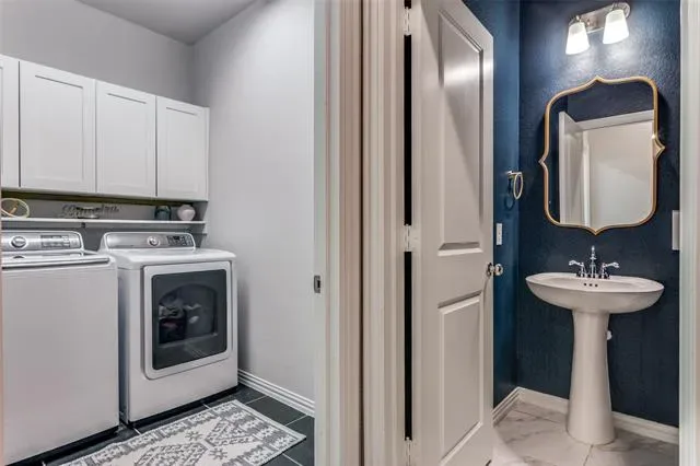 The downstairs laundry room is designed with built-in cabinetry and designer tile, adding style and functionality. Outdoor living is equally impressive with a beautifully landscaped backyard featuring an extended covered patio ideal for dining and entertaining, added side-yard concrete, and a cedar privacy fence. A luxury fence-line flower bed enhances the garden-inspired setting creating a serene outdoor retreat.