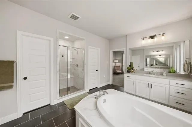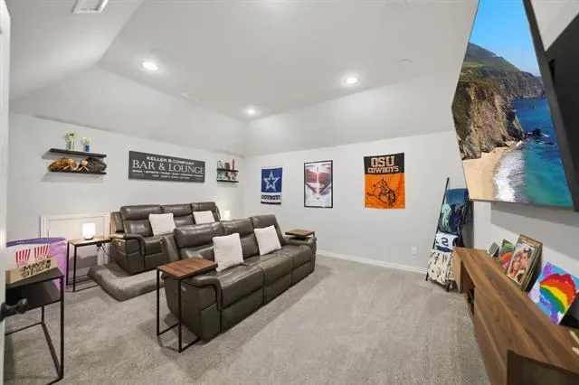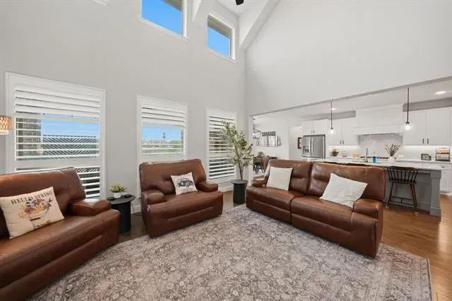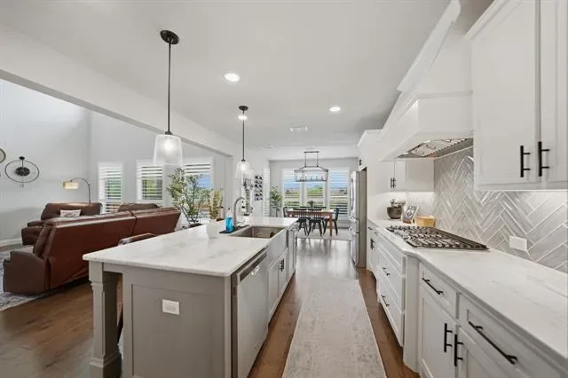 Step into style, space, & sophistication in this stunning 2021 built home offering approximately 3,353 sq. ft of thoughtfully designed living. Perfectly positioned on a desirable corner lot in the sought after Berkshire Richmond Community of N. Ft Worth, this 4 bedrm, 3 bath, designated office which also has a removable partition, mudrm, guest bedrm down, & 3 car tandem garage is a rare gem to find & will check every box. From the moment you enter, you will notice the elevated finishes & modern touches throughout. The high ceilings w beaming natural light through the windows from living rm w brand new remote controlled shades showcases the crisp white kitchen is totally a true show stopper, featuring an oversized island, elegant herringbone backsplash, gas cooktop, coffee & wine bar. The open concept layout flows seamlessly into the living area, highlighted by a cozy gas fireplace & walls of windows that frame serene greenbelt views and the outdoor paradise. Primary suite conveniently located on the first floor offers a luxurious retreat with a beautifully designed modern ensuite bath. Upstairs, enjoy endless entertainment w a spacious game rm & dedicated media rom perfect for movie nights & hosting guests. Step outside to your backyard oasis complete w an oversized covered patio & a gorgeous Gunite sparkling pool, all backing to a peaceful greenbelt where you can unwind and take in breathtaking Texas sunsets. Loaded with upgrades galore & designed for both comfort & style, this exceptional home blends luxury living w everyday functionality in one of the area’s most desirable neighborhoods that offers an amazing pool, playground, catch release fishing, walking biking trails, & paint a rock & add it to the painted ROCK SNAKE trail. This LOCATION is amazing & is in the desirable Northwest ISD & is super close to Costco, Target, Alliance Town Center shopping including restaurant choices to savor your flavor. This home won’t disappoint so don’t let this one slip away.