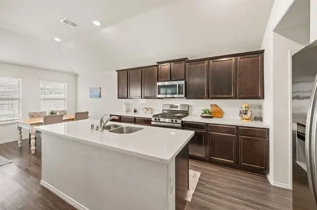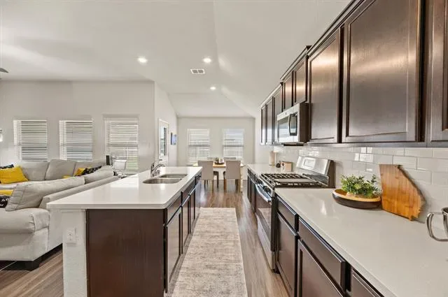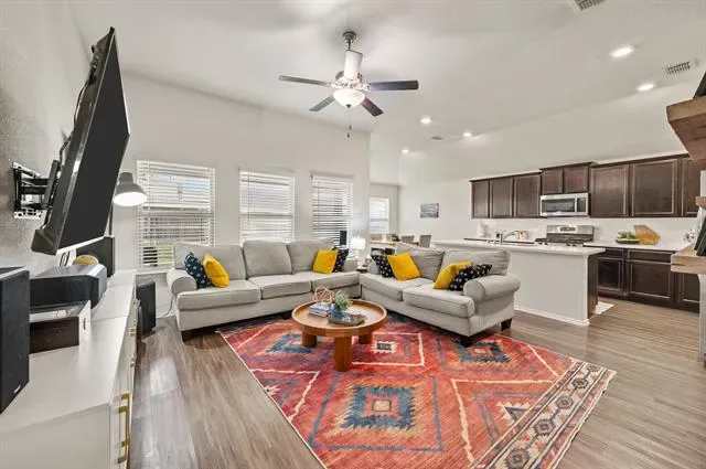 Location, lifestyle, and low-maintenance living, this one truly checks all the boxes! Built in 2019 and convenient to I-35W and Hwy 287, this move-in ready home offers quick access to Presidio, Alliance, and commute routes, ideal for those who like to be connected. Inside, you’ll find a thoughtfully designed open-concept layout valuable storage opportunities, durable vinyl plank flooring throughout all high-traffic areas, quartz countertops, espresso stained cabinetry, and a gas cooktop, all beautifully complemented by natural light streaming in from multiple rear-facing windows . The functional 3-bedroom, 2-bath floor plan offers appeal to first-time buyers, those looking to simplify, or investors seeking a strong rental opportunity. Step outside to a generously sized backyard with fresh landscaping and a patio enhanced with rock and stone, creating additional space to entertain, unwind, or design your ideal own outdoor retreat. Additional highlights include smart home features such as a smart lock and HVAC control, along with a roof replaced just two years ago. Zoned to Eagle Mountain-Saginaw ISD and surrounded by continued growth, convenience, and accessibility, this home is positioned to serve you well now and into the future