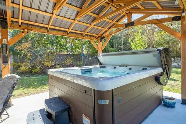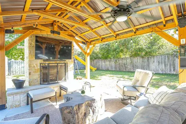 with masonry fireplace and quaint bookshelves. Incredible backyard with next-level outdoor loggia that features a massive stone fireplace to enjoy the outdoors during every season. Oversized garage with epoxy coated flooring, nice back patio, fully fenced backyard and newly installed auto security gate. The BEST location close to Shady Oaks Country Club, great restaurants and retail and terrific proximity to IH30 and all things Fort Worth!