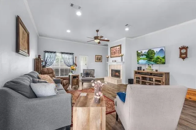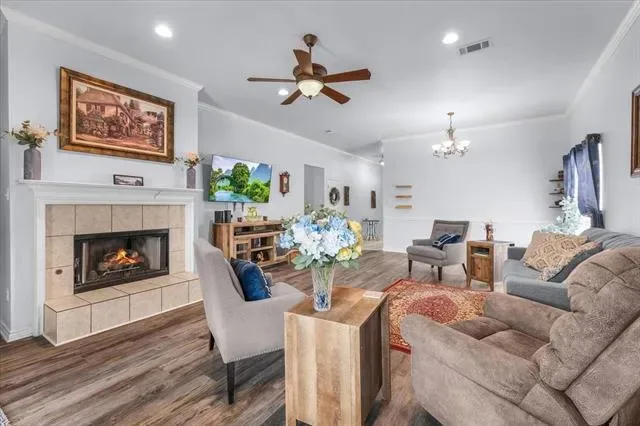 Seller has completed tons of updates including fresh paint, tile, and stainless steel appliances. The split floorplan is perfect for entertaining with an open-concept layout, spacious eat-in kitchen with pantry, and a great room featuring vaulted ceilings, an elegant fireplace, and direct access to a covered back patio with natural slate tile. Wood laminate flooring throughout adds warmth while remaining low maintenance.