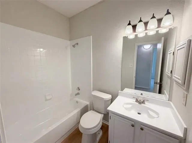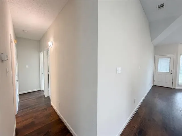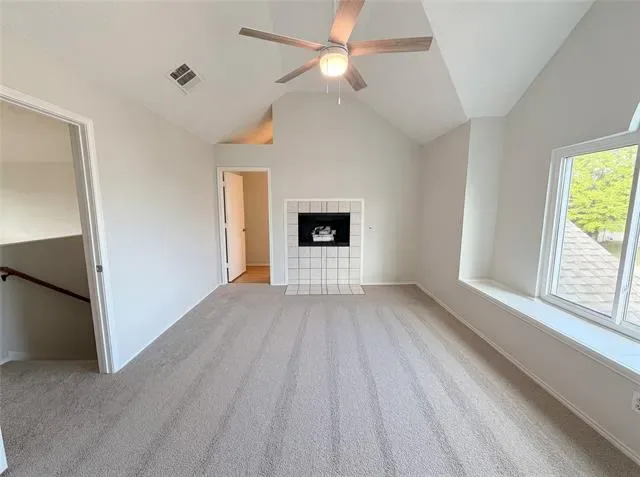 A fireplace stands as the central focal point within 9048 Elbe Trl. The kitchen features all stainless steel appliances. The primary bathroom includes double sinks followed by a separate tub and shower. Exterior access leads to a covered patio and a fenced in backyard. The interior includes fresh interior paint alongside partial flooring replacement. The property layout remains consistent throughout the entire structure. Home comes with a 100-Day Home Warranty and a 7-Day Home Test Drive to move in 7 days early for free