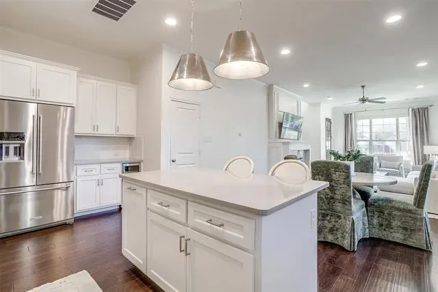 Inside, the open-concept layout is filled with natural light and designed for both everyday living and entertaining. The kitchen features quartz countertops, KitchenAid stainless steel appliances, a built-in wine refrigerator, and generous prep space that flows seamlessly into the main living area. The living room is centered around an electric fireplace, creating a comfortable place to gather or unwind.