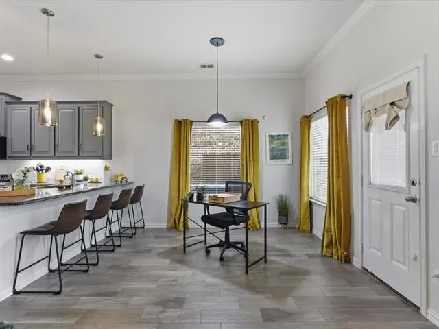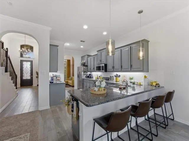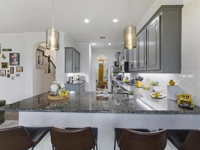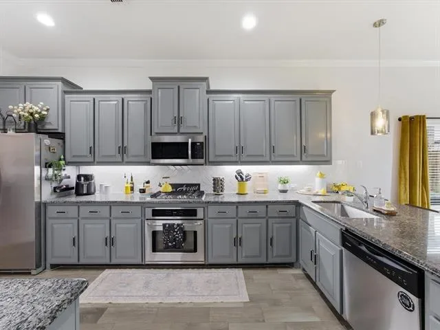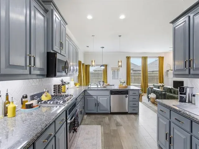 The kitchen is designed for both style &' functionality, featuring ample cabinetry, generous counter space, &' abundant storage. A frosted glass door pantry with a provides additional organization while maintaining a clean, modern aesthetic. Stainless steel appliances, gas stove, pendant lighting, &' a spacious layout.