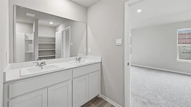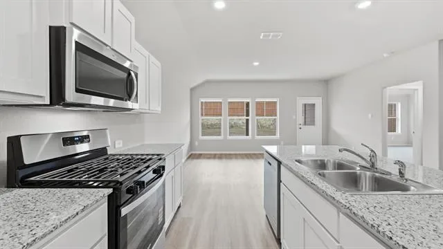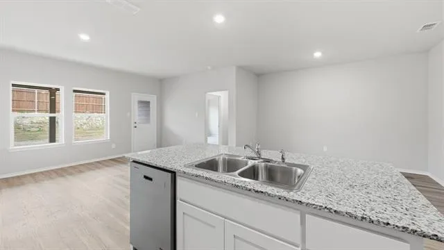 Stunning new D.R. Horton home in the Rock Creek Ranch community located in Fort Worth and Crowley ISD! The single-story Easton floorplan elevation A, with an estimated Summer completion, offers 4 bedrooms, 2 bathrooms, and a 2-car garage with a spacious open-concept layout designed for both comfort and everyday functionality. The family room flows seamlessly into the dining area and contemporary kitchen, creating a warm and inviting space ideal for gatherings and entertaining. The thoughtfully designed kitchen features quartz countertops, 36” painted cabinets, stainless steel appliances, a gas range, stainless steel sink, center island, and a walk-in pantry for ample storage. The private primary suite is tucked away and includes an en-suite bath with dual quartz vanities, a 5-foot oversized shower, and a walk-in closet conveniently located off the bathroom. Three secondary bedrooms and a full bathroom with a quartz vanity top provide flexible space for family members, guests, or a home office. Luxury vinyl plank flooring enhances the main living areas and wet zones, offering durability and low-maintenance appeal. Built with energy-efficient construction and equipped with America’s Smart Home Technology. Exterior highlights include a landscape package, full sprinkler system with rain sensor, privacy fencing, and more. Planned community amenities include a future pool, parks, playground, and walking trails. Located just two miles from Benbrook Lake with easy access to shopping, Fort Worth attractions, and nearby schools.
