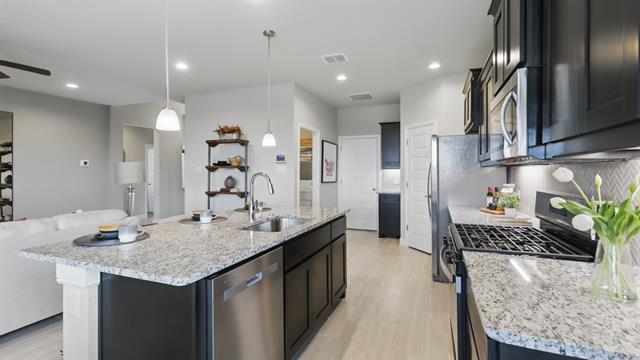 Stunning new D.R. Horton home in the Rock Creek Ranch community located in Fort Worth and Crowley ISD! The Parrot floorplan, Elevation F, with a quick estimated Spring completion, offers a thoughtfully designed single-story layout featuring 4 bedrooms, 2 bathrooms, and a 2-car garage, ideal for comfortable everyday living. The open-concept design connects the spacious family room with the dining area and modern kitchen, creating an inviting space for gatherings and entertaining. The kitchen is equipped with 36” painted cabinets, quartz countertops, stainless steel appliances, and a gas range, along with a pantry for added storage. Luxury vinyl plank flooring extends throughout the main living areas, providing durability and style. The private primary suite includes a well-appointed en-suite bath and a generous walk-in closet, while three secondary bedrooms offer flexibility for family, guests, or a home office. A covered patio enhances outdoor living, and thoughtful design details, modern finishes, and energy-efficient construction complete this impressive home. Built with energy-efficient construction and equipped with America’s Smart Home Technology. Exterior highlights include a landscape package, full sprinkler system with rain sensor, and privacy fencing. Residents will enjoy future community amenities such as a pool, park-playground, and walking trails. Located just two miles from Benbrook Lake, the neighborhood offers convenient access to shopping, Fort Worth attractions, and nearby education options.