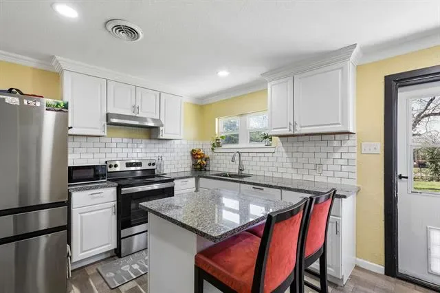Move-in ready midcentury modern home with cedar posts at the front porch and a large yard. This home features a Bright living area and LVP flooring throughout the home. The kitchen features granite countertops, subway tile backsplash, island, farmhouse sink, and breakfast area.