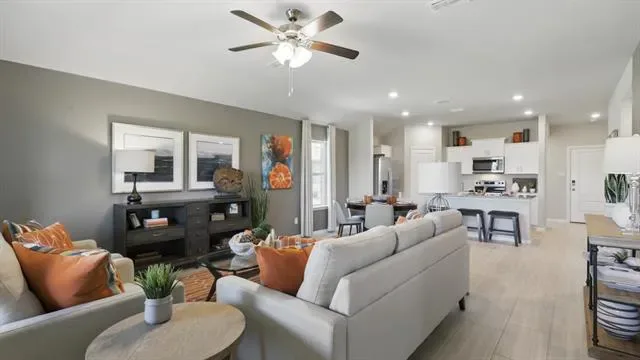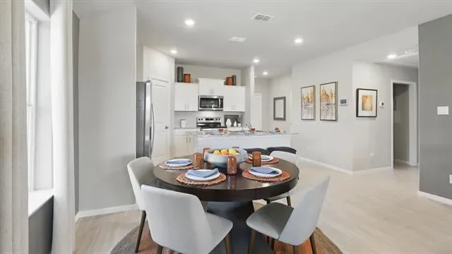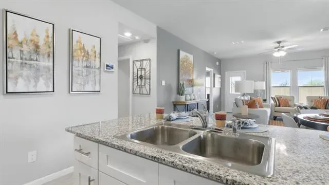 NOW SELLING in the NEW D.R. HORTON COMMUNITY of ROSEWOOD AT BELTMILL in NORTH FORT WORTH and EAGLE MTN ISD!! The beautiful Elgin elevation-B, has an estimated Spring Completion. This is a single story home that offers 4 bedrooms, 2 bathrooms and approx 1,655 sq. ft. of living space. As you enter the home, you’ll pass one secondary bedroom with a spacious walk-in closet. Continue through the foyer and find an open concept kitchen, dining room, and living room. The kitchen comes equipped with stainless steel appliances with gas cooking range, granite countertops, a corner walk-in pantry and a large kitchen island. The living room offers plenty of natural light and leads out to the large covered patio. The private main bedroom suite is located off the living room and features a huge walk-in closet and large walk-in shower with ceramic tile surround. Additional features include: tankless water heater; Luxury vinyl flooring at Entry, Hallways (per plan), Kitchen-Breakfast, Utility and Bathrooms; and, full yard sod landscaping and irrigation. The Elgin includes our America’s Smart Home base package. Using one central hub that talks to all the devices in your home, you can control the lights, thermostat and locks, all from your cellular device. Future Amenity Center, complete with a resort-style pool. Nearby nature, wildlife, and outdoor activities include Eagle Mtn Lake offering Boat and Jet Ski rentals; Eagle Mtn Park offering hiking trails and nature; and Twin Points Park offering seasonal beach and party area rentals.