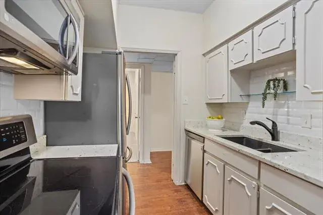 Rare first-floor condo in the popular, well-located Royale Orleans East! This 1,507 sq ft unit offers 2 bedrooms, 2 baths, and two living areas with warm wood floors and abundant natural light. The kitchen features granite counters and a handy coffee bar. The spacious primary bedroom includes an ensuite bath and large walk-in closet, while the second bedroom also has excellent closet space. The second bath has been nicely updated. Enjoy the convenience of parking just outside the back door, plus beautifully maintained grounds and a community pool. A wonderful opportunity in a highly sought-after area near TCU!