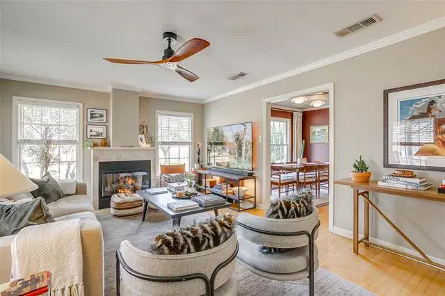 Inside, you’ll find fresh interior paint, updated lighting, and a warm, inviting living space centered around a cozy fireplace. The kitchen features stainless steel appliances and flows seamlessly into the main living areas, creating an ideal setting for both everyday living and entertaining.