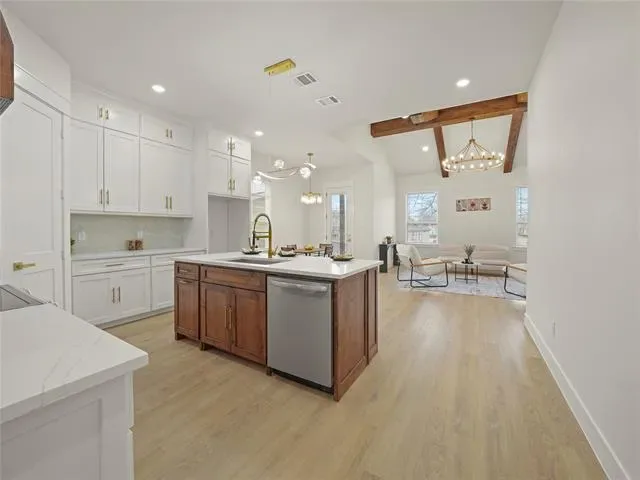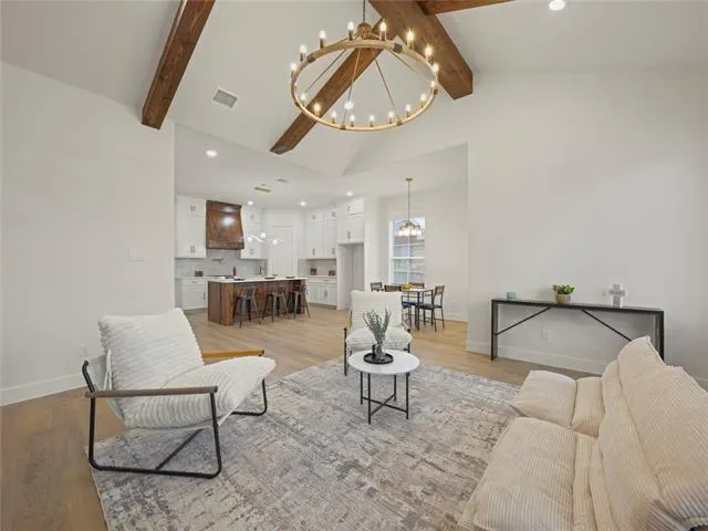 Beautiful new construction home just 10 minutes from Downtown Fort Worth offering modern design and thoughtful layout. This 4-bedroom, 2-bath home features an open concept floor plan with vaulted ceilings and exposed wood beams that create a bright and spacious living area. The kitchen is designed for both functionality and style with quartz countertops, custom cabinetry, a large island, and elegant gold accents throughout.